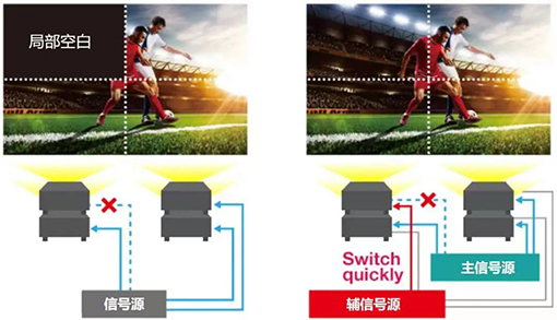 備份信號(hào)輸入功能能夠在信號(hào)丟失的情況下,0.3秒內(nèi)進(jìn)行主備信號(hào)的自動(dòng)切換,保障不中斷的信號(hào)輸出。