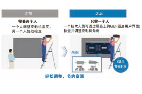 PT-FEQ120C系列工程投影機(jī)內(nèi)置陀螺傳感器,可在安裝時(shí)檢測(cè)機(jī)身角度變化,并將該信息顯示在設(shè)置菜單中,僅需一位技術(shù)人員就可完成角度的調(diào)整和安裝。