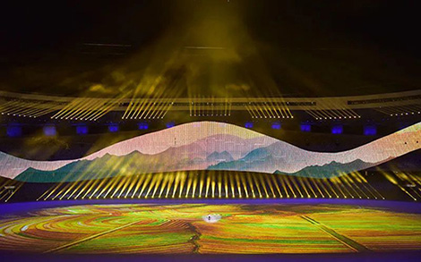 新疆十四運開幕式突破了常規(guī)舞臺表演的格局,巧妙結合地面投影和側面墻體投影,營造多維的影像空間,松下10臺PT-SRQ50KC、44臺PT-SRZ34KC、40臺PT-SMZ20KCL工程投影機,將一幅充斥著新疆旖旎風光的畫面呈遞觀眾眼前。