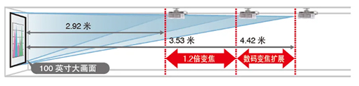我們以PT-LMZ460C投影100英寸畫面為例,原本最遠的投影距離約為3.53米,啟用數(shù)碼變焦功能后,投影距離可以進一步擴展至4.42米。