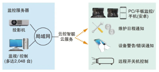 當然,支持可選無線模塊進行無線投影,無線功能支持二維碼掃描,輕松連接無線局域網(wǎng)。在聯(lián)網(wǎng)環(huán)境下,可通過云服務器遠程實時操控開關(guān)機、設(shè)備警告/故障通知及維護日程通知等。