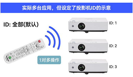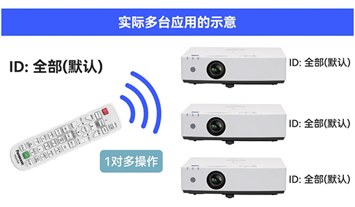 使用一個(gè)遙控器,同時(shí)操作現(xiàn)場(chǎng)的所有投影機(jī)(每臺(tái)投影機(jī)都沒有被分配唯一的ID號(hào))。