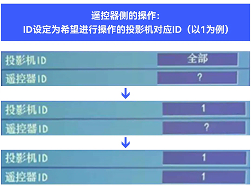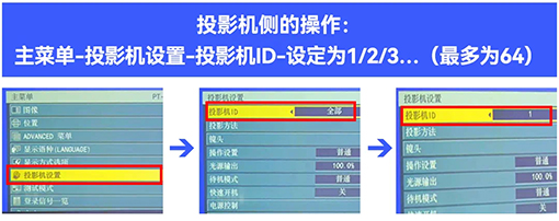 1)投影機(jī)ID設(shè)定:【主菜單】→【投影機(jī)設(shè)置】→【投影機(jī)ID】→【設(shè)定為需要的ID號(hào),可設(shè)為1-64】