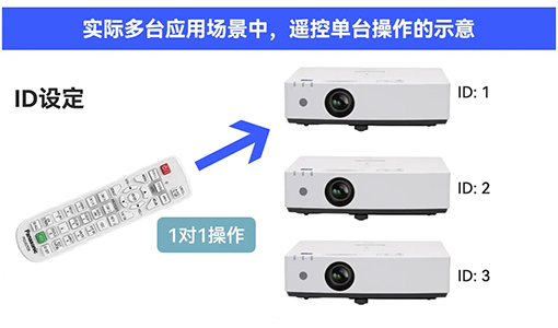 使用一個(gè)遙控器,同時(shí)操作現(xiàn)場(chǎng)的所有投影機(jī)(每臺(tái)投影機(jī)分配有唯一的ID號(hào))。