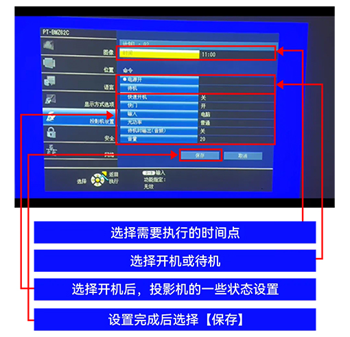 照以上步驟設(shè)置完成后,當(dāng)日程功能設(shè)置為【開啟】時(shí)。投影機(jī)便會(huì)按照我們所設(shè)置的日程計(jì)劃,定時(shí)開關(guān)機(jī)啦!