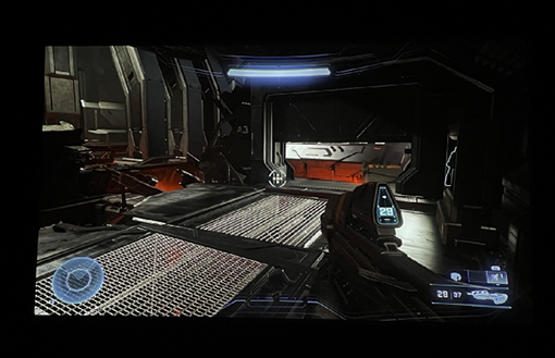 一進入《光環(huán):無限》游戲,就被這黑得有細節(jié)的畫面所吸引:透過腳下銀灰色的鋼絲網可以隱約看到下面一層的布景,右側在明暗光線下若隱若現(xiàn)的櫥柜中藏著補給,在燈光的照射下,左前方的裝置和柱子呈現(xiàn)出灰白、銀綠、墨黑等種種細節(jié)……這些無疑能給緊張刺激的射擊游戲增添了更多機會和體驗。