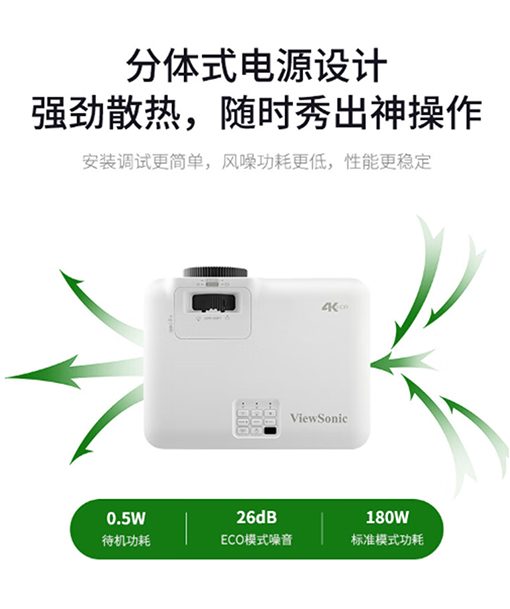 就比如LX700-4K投射比僅1.06-1.45,配合無損光學(xué)變焦和鏡頭位移功能,讓投射畫面有了更多的調(diào)整余地和可操作性。體積小巧僅286x216x129mm,這不僅得益于LX700-4K使用的是第三代激光光源,更小的模塊設(shè)計和更小的體積帶來同樣的亮度,同時也是因為采用了分體式電源設(shè)計的原因。體積的小巧也降低了投影的散熱需求及風噪,在節(jié)能模式下風噪僅26dB。此外,在標準模式下,LX700-4K功耗僅180W,在保障亮度的情況下,可以說是功耗小了,而功耗小的投影,在散熱方面也表現(xiàn)更佳。
