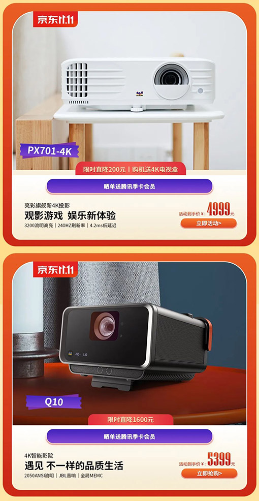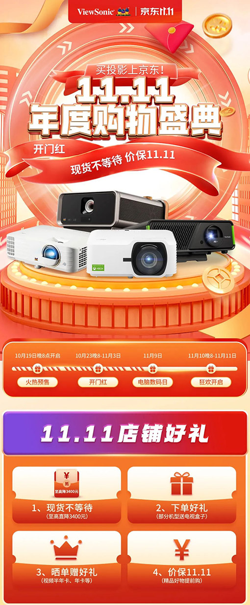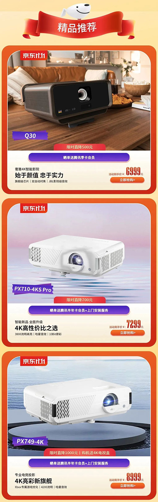 [投影之窗消息] 買投影上京東,11.11優(yōu)派店鋪四重好禮等你來:1.現(xiàn)貨不用等(至高直降3400元);2.下單好禮(部分機型送電視盒子);3.曬單贈好禮(視頻半年卡、年卡等);4.價保11.11(精品好物提前購)。