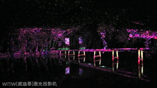 第三是“橋”方案,2臺(tái)10000流明亮度1920×1200分辨率的WITIW(威迪泰)UEC-WU100進(jìn)行2通道融合投影,超大尺寸的畫面覆蓋在小橋與岸邊樹林上,如同創(chuàng)造一幅畫卷。