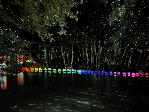 最后是“岸邊石墩”方案,同樣是2臺(tái)WITIW(威迪泰)UEC-WU100進(jìn)行2通道融合投影,如同彩虹倒映在水中,塑造童話一般的夜景。