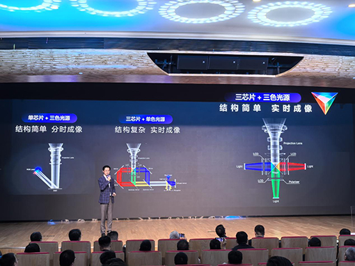 過(guò)去有很多廠商做了各種各樣的嘗試,但是把三芯片加三色光源成本做到可控,體積做到可控,迄今為止沒(méi)有一個(gè)廠商做得到,那么愛(ài)普生是率先實(shí)現(xiàn)三芯片加三色光源的技術(shù)路線,這個(gè)三芯三色的全彩引擎可能是迄今為止全球最小的三芯片三色光源的4k投影系統(tǒng)。