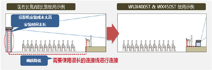 而在長(zhǎng)焦和超長(zhǎng)焦投影市場(chǎng),WUX400ST和WX450ST也可以成為新的替代選擇。無(wú)論是在大型會(huì)議室、賓館宴會(huì)廳或大學(xué)禮堂,WUX400ST和WX450ST都完全可以安裝在演講人身后,來(lái)實(shí)現(xiàn)足夠大面積的投影,這樣不僅相對(duì)傳統(tǒng)長(zhǎng)焦投影機(jī)可以縮短安裝時(shí)間和成本,同時(shí)也不會(huì)因?yàn)檫B接線(xiàn)過(guò)長(zhǎng)而導(dǎo)致畫(huà)質(zhì)降低以及投影距離過(guò)長(zhǎng)造成亮度損耗,此外,還能避免演講人進(jìn)入投影光線(xiàn)區(qū)域內(nèi),對(duì)演講人產(chǎn)生影響。
