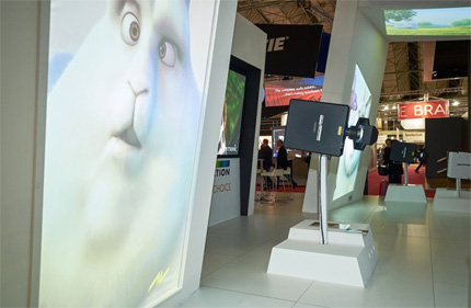 在展臺入口處以豎屏模式背投的激光投影機,HIGHlite Laser投影機在后臺朝上投射