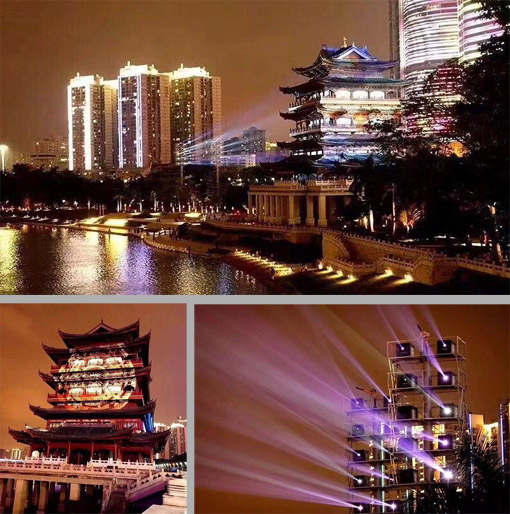 暢游閣投影秀是由DP團隊設計、安裝、調試整體總包的項目。在只有20天的短時間內內完成40臺MV18K+22臺EV6500的高空安裝調試,非常具有挑戰(zhàn)性。戶外投影非常考驗投影機性能,在結構復雜的超大面積建筑表面,要想獲得出色的畫面效果,需要超高亮度和卓越畫質。此外,戶外溫差變化、天氣狀況對投影機的穩(wěn)定性耐久性要求也更高。