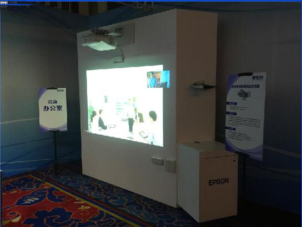 方案組成:愛(ài)普生超短焦投影機(jī)CB-1430Wi一臺(tái),寶利通視頻會(huì)議終端Group系列一個(gè)。