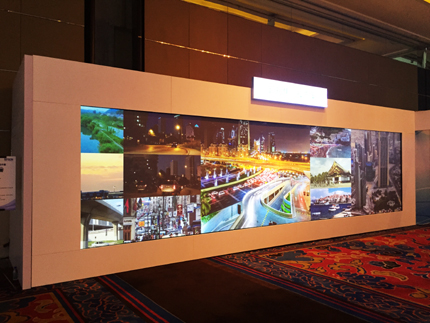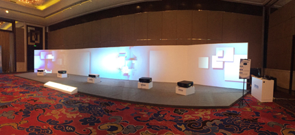 方案組成:愛(ài)普生激光工程投影機(jī)CB-L1200U三臺(tái),超短焦0.35投射比鏡頭ELPLX01三個(gè),3.8米×2米背投屏幕,工作站(帶overlap功能顯卡)。
