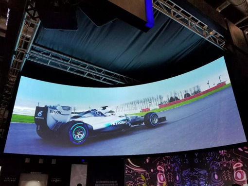 走進(jìn)愛(ài)普生展位,在一塊5.76 x 2m的曲面巨幕前,激烈的F1大賽,讓我們仿佛置身賽事現(xiàn)場(chǎng)。