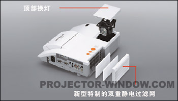 在投影機的使用和維護方面,日立HCP-A81更是毫不遜色。投射鏡的自動開合功能,免除了投影鏡頭蓋維護的繁瑣程序,還實現(xiàn)了有效防塵;新型的特制雙重靜電過濾網(wǎng)在防塵更加高效的同時,維護周期也從400小時提升到了高達5000小時,大大減少了維護成本;頂部換燈功能和后置過濾網(wǎng),使吊裝使用時的換燈和維護更加便捷,讓用戶切身的體驗人性化設(shè)計的低成本投影。