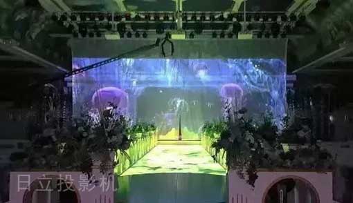 撫順盛宏威尼斯酒店,應(yīng)用日立工程機(jī)投影機(jī),打造了超凡視覺體驗(yàn)的高科技全息宴會(huì)廳;多臺日立HCP-D777X將畫面投射在多塊超大環(huán)形全息紗幕上,讓婚禮步入“全息3D婚禮新時(shí)代”。投影機(jī)配合高科技3D技術(shù),將喜宴文化和多媒體顯示有機(jī)結(jié)合,呈現(xiàn)出影院大片的氛圍效果,打造炫彩視覺婚禮SHOW。