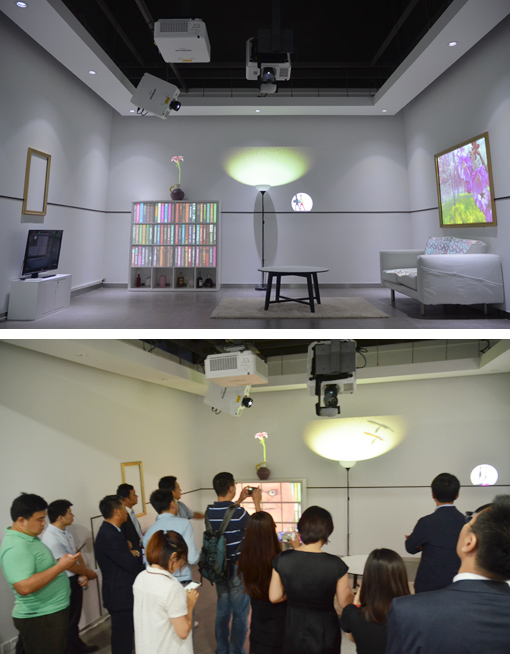 客廳方案使用能在指定空間中讓投影自由動(dòng)起來的活動(dòng)鏡面來進(jìn)行“活躍”的家居光雕投影展示。3臺(tái)TCP-WL6000U激光光源投影機(jī)進(jìn)行空間光雕投影,1臺(tái)Mirror