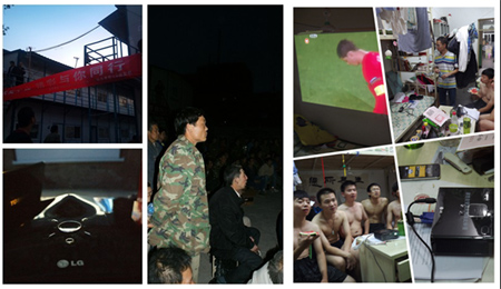 除了在宿舍這樣的室內(nèi)環(huán)境可以使用投影機外,投影機亦可在環(huán)境較差的露天工地播放電影。今年4月末,大學生公益組織中央民族大學紅十字分會聯(lián)手LG投影機,為來自中建二局的工友們帶來了一場精彩的電影,開啟了今夏豐富農(nóng)民工文化生活的序幕。投放電影的場地正是在工友們的生活區(qū),露天場地、一面白墻、一臺投影機,就是在這樣的環(huán)境下組成了一個“工地電影院”,LG的投影設(shè)備BX503B出色的完成了為農(nóng)民工放電影的任務(wù),播放效果堪比室內(nèi)投影效果。