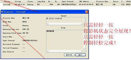 4.0軟件為主的中控解決方案,用戶即可隨意查看網(wǎng)絡(luò)上任意一臺投影機(jī)的使用時(shí)間、信號來源、是否正常運(yùn)行等狀況信息。此外,依仗PC Control