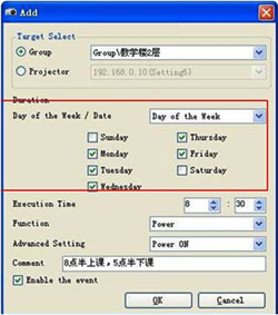 4.0軟件內(nèi)置了人性化的時(shí)間控制程序,能按星期、組別甚至精確到每天的每個(gè)時(shí)段進(jìn)行自定義演示,且允許用戶提前設(shè)定每臺的開關(guān)機(jī)時(shí)間,根據(jù)學(xué)期課表做到統(tǒng)一有效的時(shí)間管理。不但如此,PC
