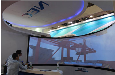 鑒于實(shí)驗(yàn)室在高校中已經(jīng)十分普及,5臺(tái)NECPX750U+投影機(jī)特在會(huì)場(chǎng)中搭建出了“仿真實(shí)驗(yàn)室曲面投影解決方案”,180°的弧形熒幕足以讓分散在各個(gè)角落的與會(huì)者,都能夠清晰、完整的看到演示資料。PX750U+內(nèi)置的幾何校正功能支持靈活的畫面形狀調(diào)整,再配合卓越的“邊緣融合”功能,最終達(dá)成了完全匹配曲面屏幕的投影效果。值得一提的是,“仿真實(shí)驗(yàn)室”能夠通過搖桿進(jìn)行實(shí)際場(chǎng)景的漫游,為學(xué)生帶來更加真實(shí)、身臨其境的視覺感受。 |