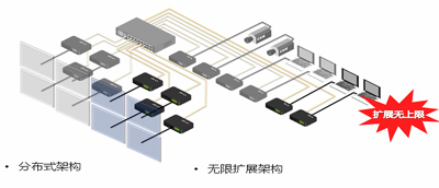 高擴展性:顯示多少內(nèi)容傳輸多數(shù)數(shù)據(jù),沒有傳輸帶寬的浪費;分布式的結(jié)構(gòu),如有擴展需求,只需要添置相應(yīng)數(shù)量的節(jié)點連接至系統(tǒng);無輸入節(jié)點的限制,可實現(xiàn)無限擴展功能。