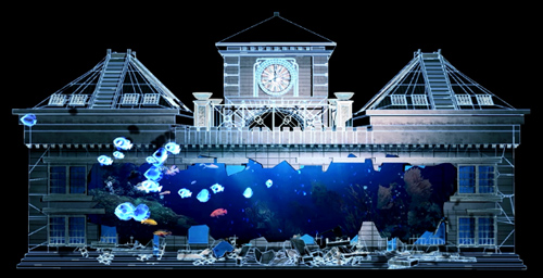 采用NEC的11000流明高清工程投影機,內(nèi)嵌OPS-PC,組成一體化解決方案,投射在建筑模型上實現(xiàn)樓體表面奇幻影像動畫特效。