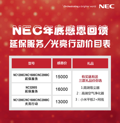 此次NEC年底感恩大促,NEC針對2K機型繼續(xù)推出延保服務(wù)、“光亮行動”的活動。延保服務(wù)——延長保修,小投入大保障,保證放映無憂;光亮行動——從本質(zhì)上提升放映機亮度,實現(xiàn)核心光學(xué)元器件的深度清潔,專注光芯級別的精密清洗和調(diào)整,是唯獨廠家才能做到的光芯級別的深度除塵服務(wù)。只要購買延保服務(wù)和“光亮行動”的任意一款,就有超值大禮送上!