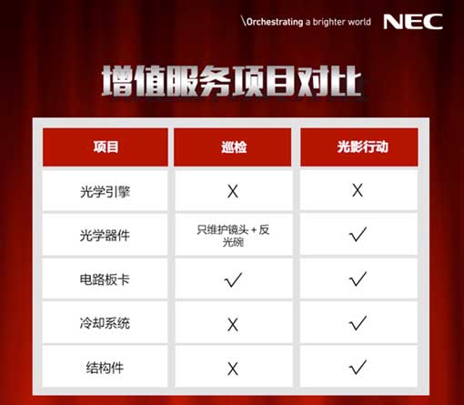 凡在活動期限內(nèi)原價購買NEC電影機(jī)延保服務(wù)的新老用戶,均可享受原保內(nèi)贈送的“巡檢”免費(fèi)升級為“光影行動”的福利。也就是說,花費(fèi)原先同樣的價錢,就可享受“光影行動”所帶來的更為優(yōu)質(zhì)深層的清潔服務(wù)。