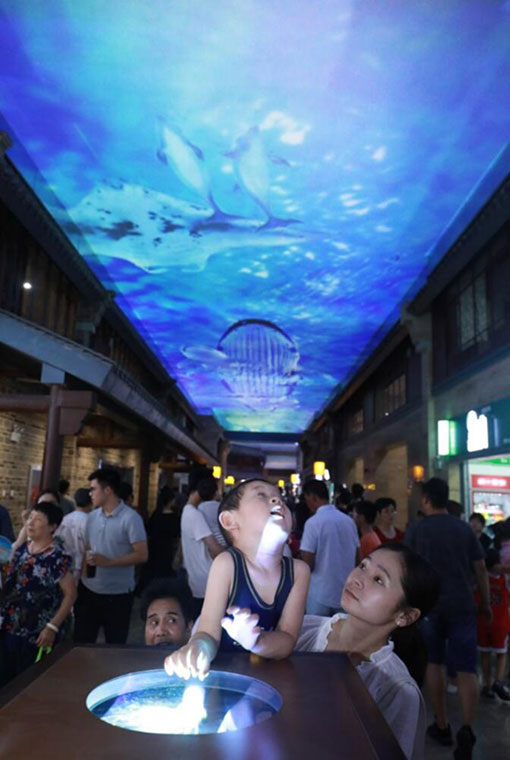 天幕輪換播放蔚藍(lán)的海底世界、綻放的絢麗煙花、浩瀚無(wú)垠的星空,編織出五彩繽紛的迷人夏夜,吸引眾多市民駐足欣賞拍照。一邊逛街購(gòu)物,一邊欣賞新奇有趣的投影天幕,已成為市民和游客的一種全新旅游休閑娛樂(lè)方式。