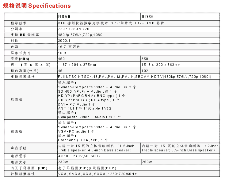 ﹡RD65AC×Ca-市面最大尺寸量產(chǎn)的DLP光顯電視。 |