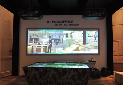 本套系統(tǒng)由兩臺松下PT-SLZ77C運(yùn)用融合技術(shù)打造而成,觸控桌面通過數(shù)據(jù)處理和圖形同步計(jì)算,實(shí)現(xiàn)全圖三維模擬,使現(xiàn)場觀眾感受影像動(dòng)態(tài)展示,領(lǐng)略圖像原態(tài)和多種特效,畫面清晰,具有超強(qiáng)的視覺沖擊力,該系統(tǒng)也可與BAVG大屏顯示系統(tǒng)結(jié)合做成互動(dòng)數(shù)字沙盤應(yīng)用。