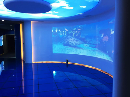 走進(jìn)展廳,一面巨大的弧幕映入眼簾。展廳內(nèi)投影畫面以正投融合的方式成像,全方位展示了海島中心在科技研究方面的豐碩成果。通過(guò)2臺(tái)6300流明高亮度的PT-FD601CL投影機(jī)的畫面顯示,參觀者可以直觀地感受到細(xì)膩且震撼的視覺效果。動(dòng)態(tài)色彩亮度控制技術(shù)的強(qiáng)大色彩表現(xiàn)力,在實(shí)現(xiàn)了高亮度的同時(shí)又提升了色彩還原度,不僅向參觀者充分展現(xiàn)企業(yè)文化,也將未來(lái)海島中心的發(fā)展藍(lán)圖清晰的呈現(xiàn)于弧幕之上。內(nèi)置強(qiáng)大的多畫面拼接系統(tǒng),完美的實(shí)現(xiàn)邊緣融合、色彩匹配及多畫面處理的功能。24小時(shí)×7天連續(xù)運(yùn)行,高效穩(wěn)定,呈現(xiàn)持久亮麗的畫面效果。松下投影機(jī)的投影顯示,讓原本深?yuàn)W的海洋科技揭開了神秘的面紗,變得更加清晰易懂。
