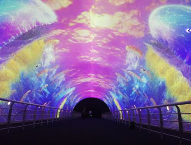 這些奇特、優(yōu)美的畫面是由28臺(tái)松下PT-FRZ68CL激光工程投影機(jī)打造,每4臺(tái)一組,在微孔鋁幕上開孔對(duì)相投射。工程師為了減少改造成本、縮短改造周期,盡可能利用現(xiàn)有可用設(shè)備,并建議使用與現(xiàn)有投影系統(tǒng)相同投射比的松下PT-FRZ68CL激光工程投影機(jī)。