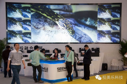 無拼縫、無限大,箱體拼接、激光背投,一個高達5米、長近9米的展項就在視美樂展位靜候指揮中心、會議中心系統(tǒng)、半室內(nèi)外廣告屏等方向的客戶蒞臨參觀。
