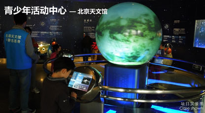 激光球幕投影解決方案,球幕直徑80CM,通過多個方位的觸摸屏來控制球幕內(nèi)容的播放,通過立體直觀的演示天文、地理方面的知識。 |