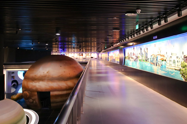 置身天文館可以“坐地日行八萬里”去感受廣闊的太空。游客可通過視美樂激光球顯系統(tǒng)來感知月球與地球之間天體互動(dòng)。將月球設(shè)置成可觸控的觀景面,在兩個(gè)星球之間做相關(guān)互動(dòng)。即可以通過月球去看地月關(guān)系,也可以通過月球去看地球的構(gòu)造。 |