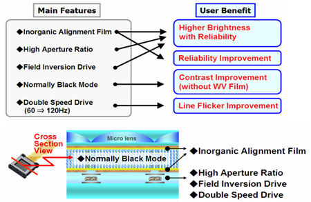 使用的全黑模式使液晶陣列顯示黑色。這種方式很少有光的散射,所以很少有光泄露,以及由很好的對比度。另外,為了更有效率的控制液晶陣列即使在顯示白色的時(shí)候,在應(yīng)用了電子域后無機(jī)配向膜和新的液晶設(shè)計(jì)已經(jīng)被最優(yōu)化了,同時(shí),也增加了亮度。