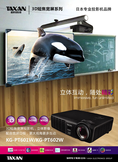 TAXAN加賀KG-PT601W投影機(jī)采用3D短焦設(shè)計(jì),配合寬屏白板獲得更大視角更多互動(dòng)。KG-PT601W投影機(jī)針對(duì)小空間設(shè)計(jì),內(nèi)部采用DLP