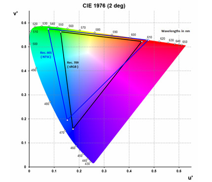 現(xiàn)已規(guī)定了各種標準色域,如 Rec.601 (NTSC)和Rec.709 (sRGB)色域(圖1)。這些色域是傳達顯示系統(tǒng)色域相對“大小”有用的參考點。一種常見方式是計算顯示器色域三角形(在u’v’空間)的面積,以及與特定標準色域三角形的比。例如,“70%
