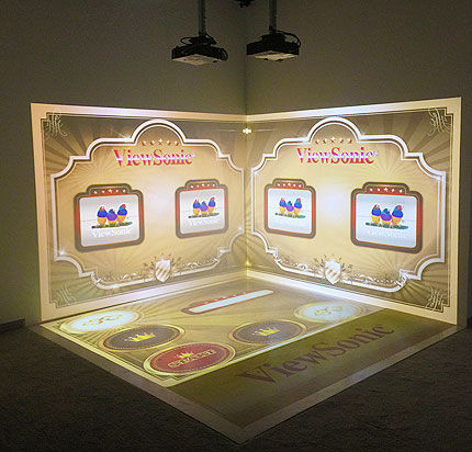 在3D互動(dòng)投影解決方案方面,優(yōu)派也不甘示弱,訪客可在展廳現(xiàn)場(chǎng)看到利用2臺(tái)3500流明的普通短焦投影機(jī)PJD6383 和一臺(tái)PJD7333搭建的一個(gè)互動(dòng)活動(dòng)區(qū),該區(qū)域的原理同樣也是通過(guò)紅外攝像頭外加一個(gè)紅外補(bǔ)光燈來(lái)捕捉人所在的位置,實(shí)現(xiàn)寓娛樂(lè)于互動(dòng)的效果。