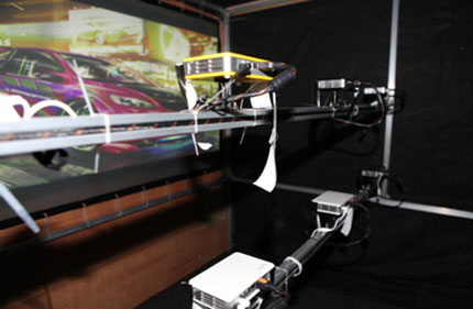 Q5進(jìn)行無縫拼接,通過背投的方式演繹了3K高分辨率畫質(zhì)的高清投影展示。由于分辨率達(dá)到了3K,并且QUMI