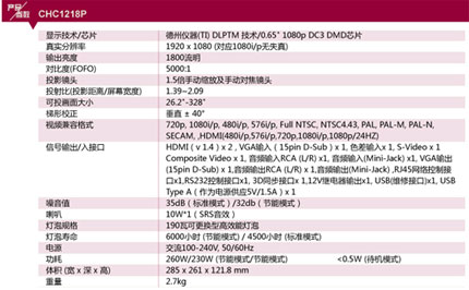 Vivitek麗訊CHC 1218P使用DLP投影技術(shù),標稱亮度1800流明,標準分辨率為1080p(1920×1080),標稱對比度為5000:1,內(nèi)置10瓦SRS揚聲器,所使用高效能燈泡,節(jié)能模式下燈泡壽命達6000小時,標準模式下燈泡壽命達4500小時。