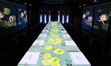 池塘”的水鄉(xiāng)清韻。在座賓客宛若置身于水荷中央,而游魚嬉戲于身旁。伸手一觸,魚兒倏忽遠遁,而留水波蕩漾。這場名為“上膳之道蓮花宴”的藝術宴會,在著名旅德藝術家王小慧的創(chuàng)意指導下,將美食、人文、現代科技完美地融為一體。