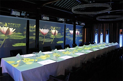D5185HD投影機搭配短焦鏡頭,通過機身自帶的鏡頭位移功能,可將機器隱身于天花結構的正中,在2.5米的距離內實現長8.4米,寬1.2米的融接畫面,同時搭配紅外線CCD裝置,實現賓客與投影的互動。 |