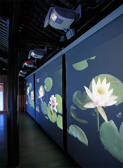 蘇州平江歷史街區(qū),明代古建筑“丁宅”,王小慧藝術館二樓。透過紗簾,微明的燭火點綴于絢麗的投影間,一場跨界藝術的盛宴正悄悄上演。15臺投影機,在筵席的桌布和兩側墻壁上投射出“荷花
