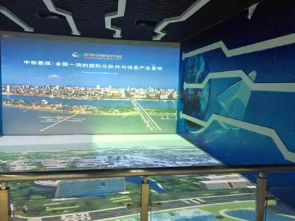 為了展示長沙中電軟件園多年來所取得的科技創(chuàng)新碩果,軟件園在大型展示廳內通過投影機拼接融合的方式,將軟件園的全景投射出來,展示了這座軟件產業(yè)基地的獨特魅力和強大實力。由于采用專業(yè)工程投影機進行全景展示,因此對投影機的性能和穩(wěn)定性都有著嚴格要求。經(jīng)過嚴格篩選和反復測試,Vivitek(麗訊)D5010工程投影機最終脫穎而出,成為了此次展示的獲勝者。8臺Vivitek(麗訊)D5010工程投影機在大型展廳內“各司其職”,其中地面采用了4臺D5010做融合展示,而正面、弧面分別采用了2臺,整個全景展示一共使用8臺Vivitek(麗訊)D5010投影機,投射畫面清晰,色彩鮮艷,圖像震撼,令人耳目一新,身臨其境。